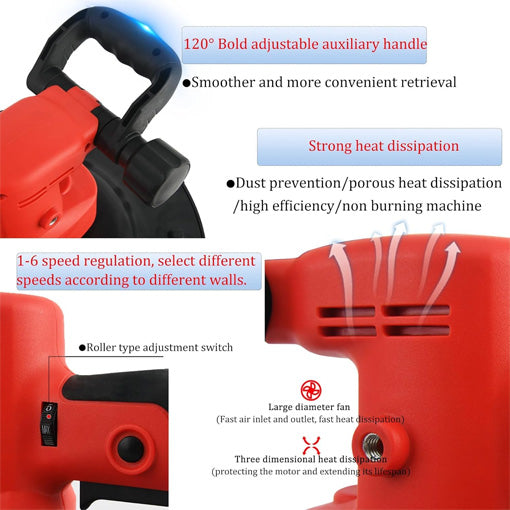 ✅ Customizable Speed and Comfort: Six speed levels let you adjust from 40 to 300 RPM depending on the wall material. The 120° adjustable handle with dual grips reduces fatigue, letting you work longer with ease.