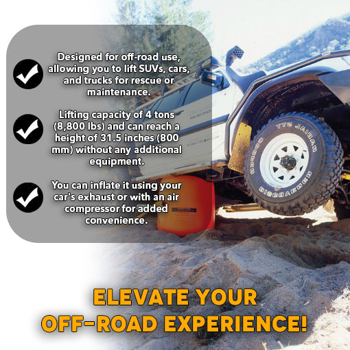 ✅Reliable: Standard jacks can be unstable on rough terrain. The Off-Road Inflatable Exhaust Air Jack is designed for off-road use, allowing you to lift SUVs, cars, and trucks for rescue or maintenance. It uses exhaust air from the vehicle's system, making it easy and convenient to operate in rugged environments.